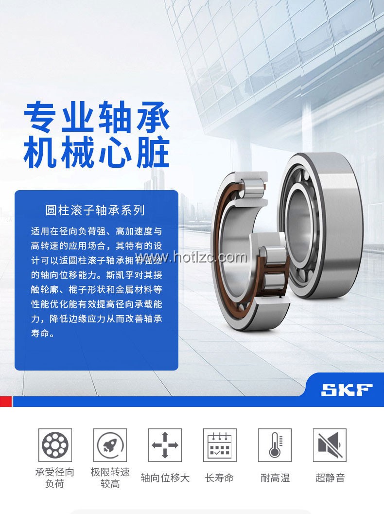 圓柱滾子與滾道為線接觸軸承。負(fù)荷能力大,主要承受徑向負(fù)荷。滾動(dòng)體與套圈擋邊摩擦小,適于高速旋轉(zhuǎn)。根據(jù)套圈有無(wú)擋邊,可以分有NU、NJ、NUP、N、NF等單列圓柱滾子軸承,及NNU、NN等雙列圓柱滾子軸承。該軸承是內(nèi)圈、外圈可分離的結(jié)構(gòu)。